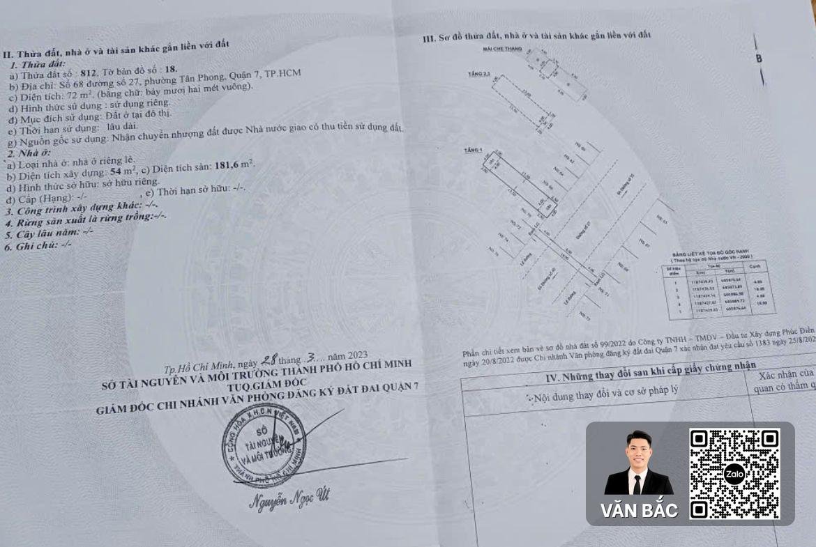 Tọa lạc tại vị trí chiến lược trong KDC An Phú Hưng, Phường Tân Phong – một trong những khu dân cư hoàn thiện và đáng sống nhất Quận 7. Căn nhà tại số 68 đường số 27 sở hữu diện tích đất 72m² (4m x 18m) với hạ tầng đường nhựa trước nhà rộng đến 20m, vỉa hè thông thoáng. Với kết cấu Trệt + 2 Lầu + Sân thượng, ngôi nhà mang đến không gian sống hiện đại, liền kề ngay khu đô thị Phú Mỹ Hưng và KDC Tân Mỹ. Giá bán 17 tỷ đồng (có thương lượng trực tiếp).
