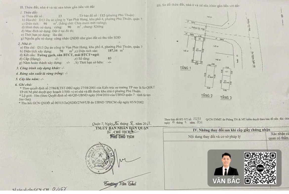 Tọa lạc trong KDC Lacasa (Vạn Phát Hưng) – một trong những khu dân cư xanh mát và đồng bộ nhất Phường Phú Mỹ, Quận 7. Căn nhà phố mang mã số D13 sở hữu vị trí đắc địa trên trục đường 12m, cực kỳ thuận tiện cho việc mở văn phòng hoặc kinh doanh đa ngành nghề. Với diện tích 90m² (5m x 18m), nhà được thiết kế tối ưu gồm 1 Trệt + 2 Lầu + Sân thượng với 4 phòng ngủ rộng rãi. Hướng Bắc mát mẻ, Giá bán: 14.5 tỷ đồng (có thương lượng).