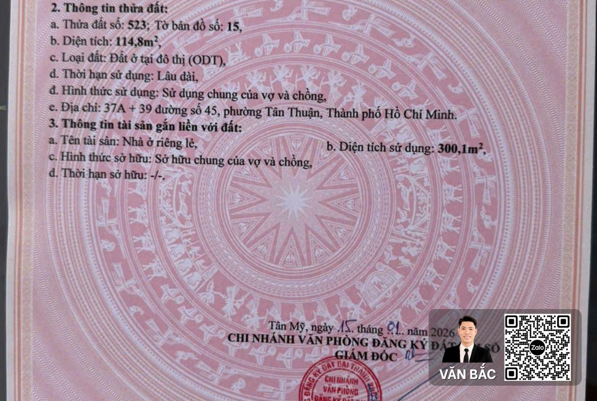 Tọa lạc tại khu dân cư sầm uất đoạn gần trục đường Lâm Văn Bền, căn nhà phố tại số 37A - 39 Đường số 45 sở hữu diện tích đất lý tưởng 6,8m x 20m (Công nhận 114,8m²). Với bề ngang rộng gần 7m, đây là quỹ đất cực kỳ khan hiếm tại khu vực trung tâm Quận 7. Hiện trạng nhà gồm Trệt + 3 Tầng với 13 phòng đang khai thác. Đặc biệt, bất động sản có chỉ tiêu quy hoạch mới lên đến Hầm + 7 Tầng, cực kỳ phù hợp xây dựng tòa nhà văn phòng hoặc căn hộ dịch vụ cao cấp. Hướng Bắc, sổ hồng riêng. Giá bán 23,5 tỷ đồng.