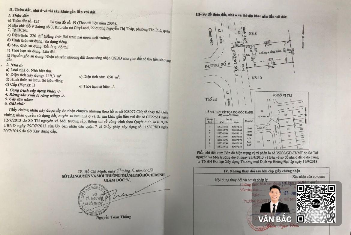 Tọa lạc tại số 9 Đường số 3, thuộc KDC CityLand Riverside, Phường Tân Phú, Quận 7 – một trong những cộng đồng cư dân sang trọng và đồng bộ bậc nhất khu Nam. Căn biệt thự sở hữu diện tích lý tưởng 220m² (10x22m) với kiến trúc tân cổ điển uy nghi. Điểm nhấn vượt trội là kết cấu Hầm + Trệt + 3 Tầng tích hợp Thang máy, đáp ứng trọn vẹn nhu cầu ở gia đình đa thế hệ hoặc làm văn phòng tập đoàn, Showroom cao cấp. Giá bán: 50 Tỷ đồng.