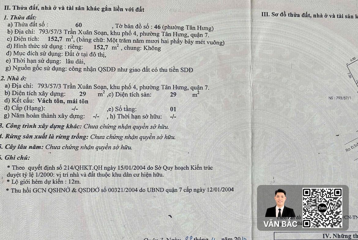 hẻm 793/20 Trần Xuân Soạn, P. Tân Hưng, Quận 7.- Đất nền thổ cư