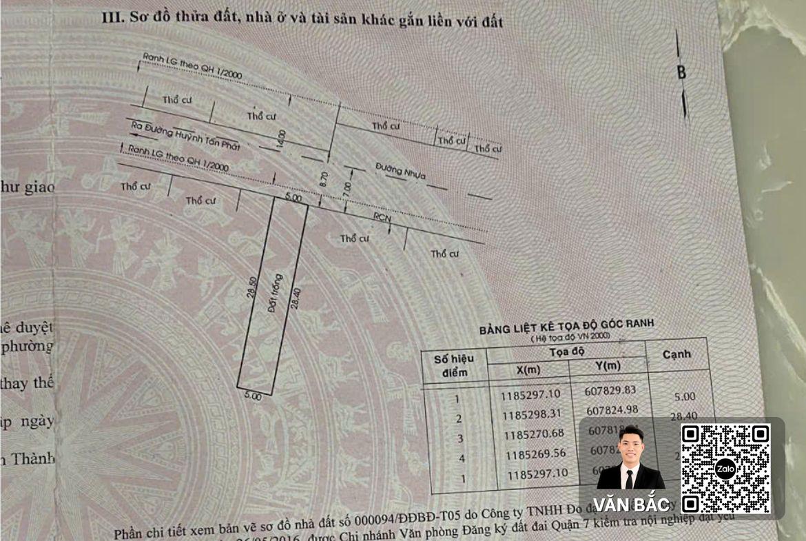 Tọa lạc tại vị trí chiến lược trên mặt tiền đường Lê Thị Chợ (địa chỉ cũ 1333 Huỳnh Tấn Phát), Phường Phú Thuận, Quận 7. Lô đất nằm ngay khu vực hành chính sầm uất, kế bên Chi cục thuế Quận 7, sở hữu khuôn đất dài lý tưởng 5m x 28.5m. Điểm đắt giá nhất là chỉ số quy hoạch cực cao cho phép xây dựng lên đến Hầm + 7 tầng, mở ra tiềm năng khai thác dòng tiền khổng lồ từ tòa nhà văn phòng hoặc căn hộ dịch vụ cao cấp. Giá bán: 15.6 Tỷ đồng (Thương lượng chính chủ).
