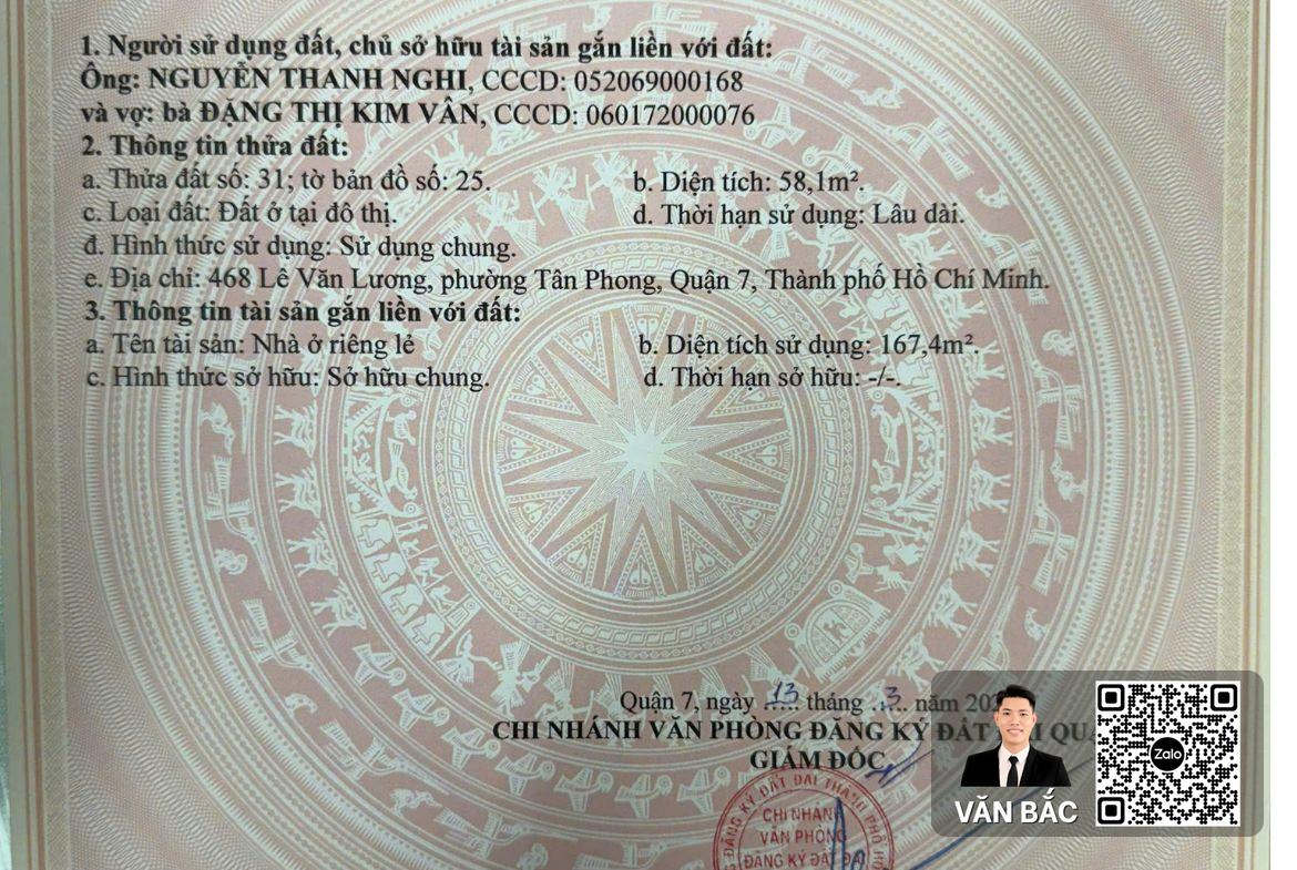 Tọa lạc tại số 468 Lê Văn Lương, Phường Tân Hưng, Quận 7 – trục đường kết nối xuyên tâm khu Nam Sài Gòn. Căn nhà sở hữu diện tích chuẩn 80m² (4x20m) với kết cấu 1 Trệt + 2 Lầu + Sân thượng chắc chắn. Với ưu thế nằm gần trường Đại học Tôn Đức Thắng và khu dân cư Him Lam, bất động sản hiện đang mang lại dòng tiền cho thuê 480 Triệu/Năm (40 triệu/tháng). Đây là lựa chọn đầu tư an toàn và hiệu quả nhất trong phân khúc dưới 15 tỷ. Giá bán: 14,5 Tỷ đồng (Thương lượng chính chủ).