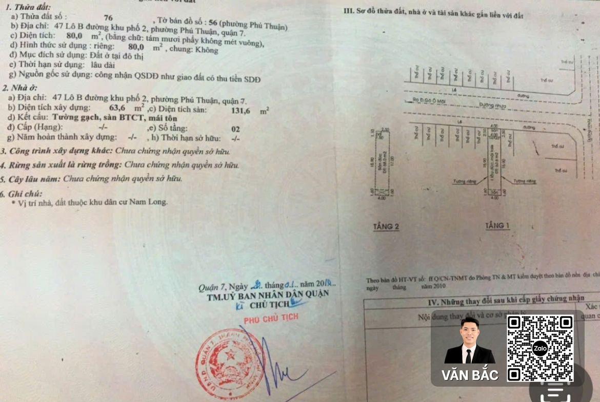 Tọa lạc tại tiểu khu Nam Long, Phường Tân Thuận Đông, Quận 7 – một trong những khu dân cư có quy hoạch đồng bộ, xanh mát và an ninh bậc nhất khu vực. Căn nhà tại lô B47 sở hữu diện tích chuẩn nhà phố 4m x 20m, nằm trên trục đường rộng 12m có vỉa hè cây xanh. Với vị trí chiến lược chỉ cách "trái tim" Phú Mỹ Hưng 500m, đây là lựa chọn hoàn hảo cho những gia đình tìm kiếm sự tiện nghi, yên tĩnh nhưng vẫn đảm bảo kết nối nhanh chóng với các tiện ích đẳng cấp. Giá bán: 10.8 Tỷ đồng (Thương lượng chốt).